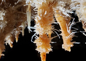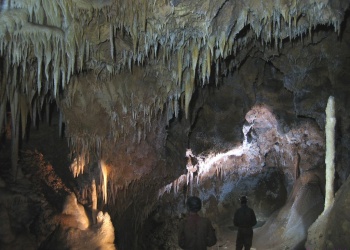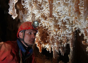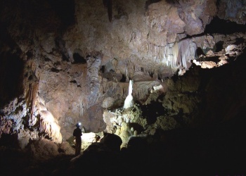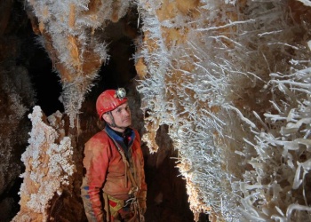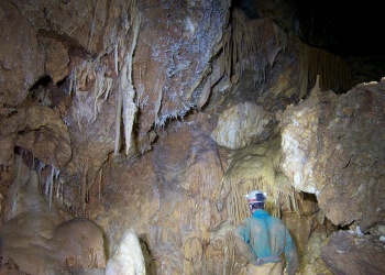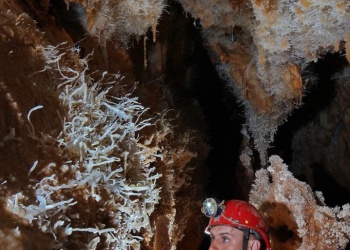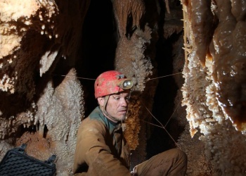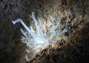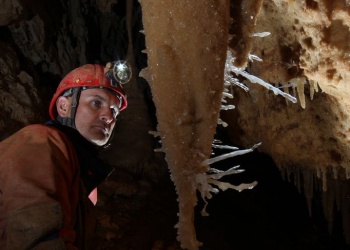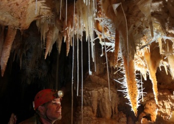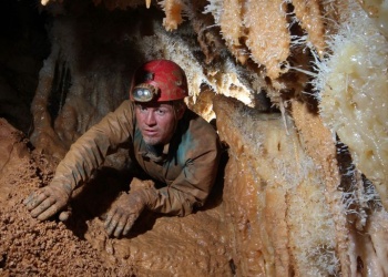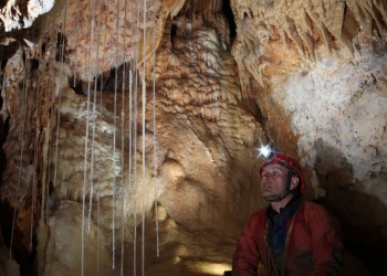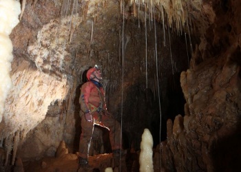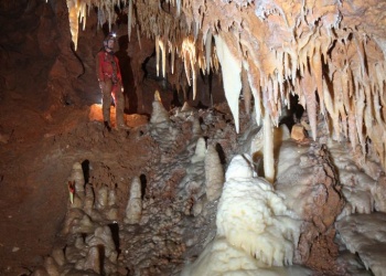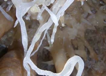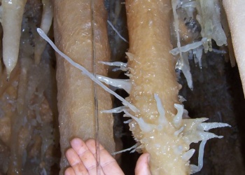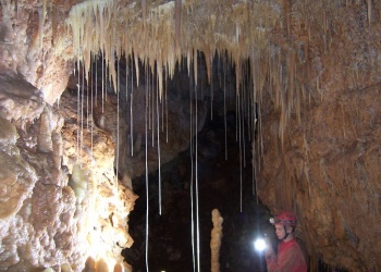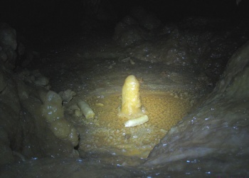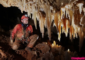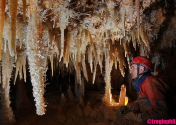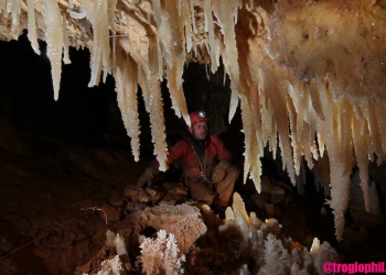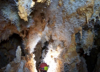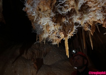 Übersetzt: Gullideckelhöhle....dementsprechend befindet sich der Eingang auch im Gulli neben einer Straße! Eine der anspruchsvollsten Höhlen der Gegend! R 4, danach einige enge Schlufe, welche direkt in einen P 18 münden. Nach diesem kommt die erste Halle. Durch einen weiteren Schluf und einen engen Mäander kommt die Schlüsselstelle: ein 15m langer doppel-S-Kurven-Schluf, welcher in einen R 10 mündet. Man steht in der größten Halle. Von hier aus führen einige Seilüberführungen an eine Verzweigung, welche in drei Etagen weiterführt. Das Reseau Superieure erreicht man über einen 40 m hohen Schachtaufstieg und ist eines der schönsten versinterten Gänge in der Gegend. Eine 70 m Seilquerung an der Verzweigungstelle bringt einen in die hinteren Teile. Die dritte Möglichkeit wäre ein 20 m Schachtabstieg ins Reseau du Lac. Die gesamte Höhle ist extrem stark versintert. Bis zu 50 cm lange Excentriques und Kristalle wachsen überall aus der Wand.