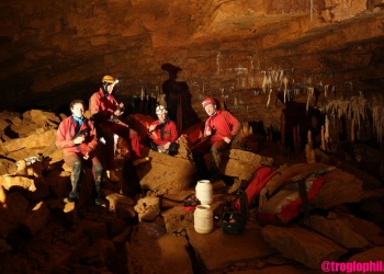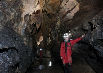 In herrlichem Buchenwald geht es am Grund einer markanten Doline nach dem (selbstverständlich) verschlossenen Eingang erstmal etwas eng nach unten. Hier hat man ganze Arbeit geleistet, um befahrbare Dimensionen herzustellen. Schon nach kurzer zeit betritt man den unterirdischen Fluss, welcher praktisch die ganze Höhle durchfließt.