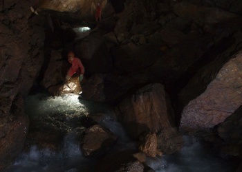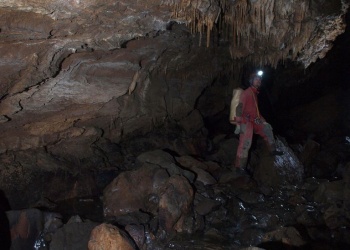 Danach wird es kurz etwas enger, bis man durch einige Mäander und Engstellen den Bachlauf des Bassaburuko erreicht. Diesen Zulauf zum Hauptfluss verfolgt man für ca. 3-4 Std., um den Salle Cosyns zu erreichen, wo auch die Schächte von Tete-Sauvage-Eingang von oben kommen. Im Nachhinein betrachtet, stellt dieser Abschnitt einen der Reizvollsten dar: Die Lampen leuchten hier die Raumdimensionen noch voll aus. Immer wieder findet sich schöner Sinter und etliche Kletterpassagen machen die Strecke kurzweilig. Ohne die angebrachten Wegweiser (Reflektoren) wäre die Wegfindung praktisch ausgeschlossen!