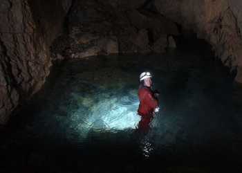Jetzt heißt es Zähne zusammenbeissen: 70 Meter Schwimmstrecke am Führungsseil im eiskalten Wasser - ca. 30 cm Luft nach oben zur Decke und ein alles übertosender Höhlensturm........DURCH. Neopren ausziehen. Unterschlaz anziehen. Essen, Trinken.