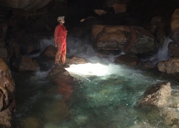 Nach dem Salle Cosyns wird der Weg linearer, das Wasser immer mehr und es gilt einige fix eingebaute Seil- auf und Abstiege zu bewältigen, ehe man Richtung Salle Susse wandert. Kurz vorher trifft sich der Zufluss des "Max Cuderec" mit dem Bassaburuko und das Wasser wird bedeutend mehr. Am ehemaligen Biwak "Tahiti" heißt es Neopren anziehen. Gleich danach geht es voll ins kalte Nass - ehe man eben im Salle Susse zum ersten mal über gewlatige Blockberge wandert.