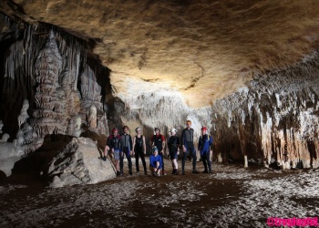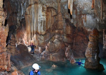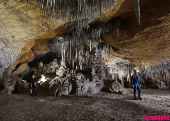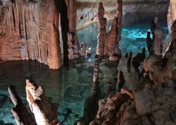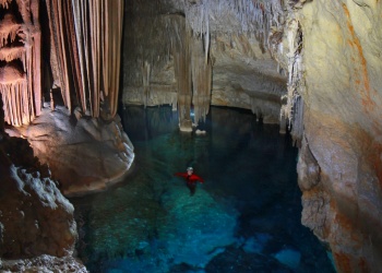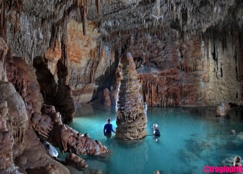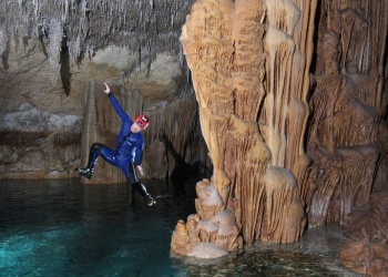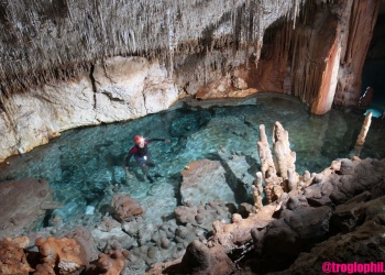 Sicherlich das Highlight im Höhlenpark der Cala Varques an der Ostküste der Insel. Bereits die Wanderung entlang der Steilküste ist eindrucksvoll. Über den berühmten Felsbogen und vorbei an einigen V10 Boulderproblemen (zum Free-Water Soloing) geht es in die Sa Coloms Bucht. Bei 100% glatter See kann man entlang den Steilklippen schwimmen und in das Eingangsportal dümpeln. Ganz am Ende des selben geht es durch einen engen Halbsiphon. Bei geringstem Seegang siphoniert dieser Bereich. Hat man dieses Hinderniss überwunden geht es los: Es wird groß, rießig und wunderschön. Man kann bis zu 7 m hohe Sprünge in das kristallklare Brackwasser (anchihalin) machen und die Sinterburgen bewundern.